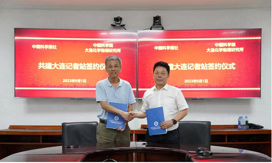 期间,报社还与大连化物所续签了共建大连记者站协议,刘峰松书记与大连化物所党委书记金玉奇代表双方签字。