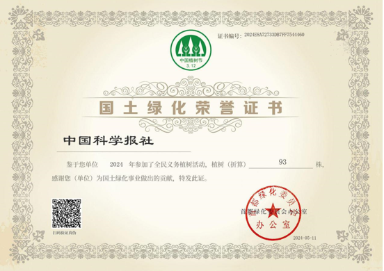 为贯彻落实习近平总书记关于全民义务植树的系列重要指示精神,将中国科学院绿化委员会办公室关于做好京区义务植树工作要求落到实处,报社于5月11日组织开展了2024年度义务植树捐资尽责活动。活动形式为以报社名义向北京绿化基金会捐款,并获得由首都绿化委员会办公室颁发的国土绿化荣誉证书。据了解,本次捐赠款项将全部用于“中央国家机关绿化项目”。